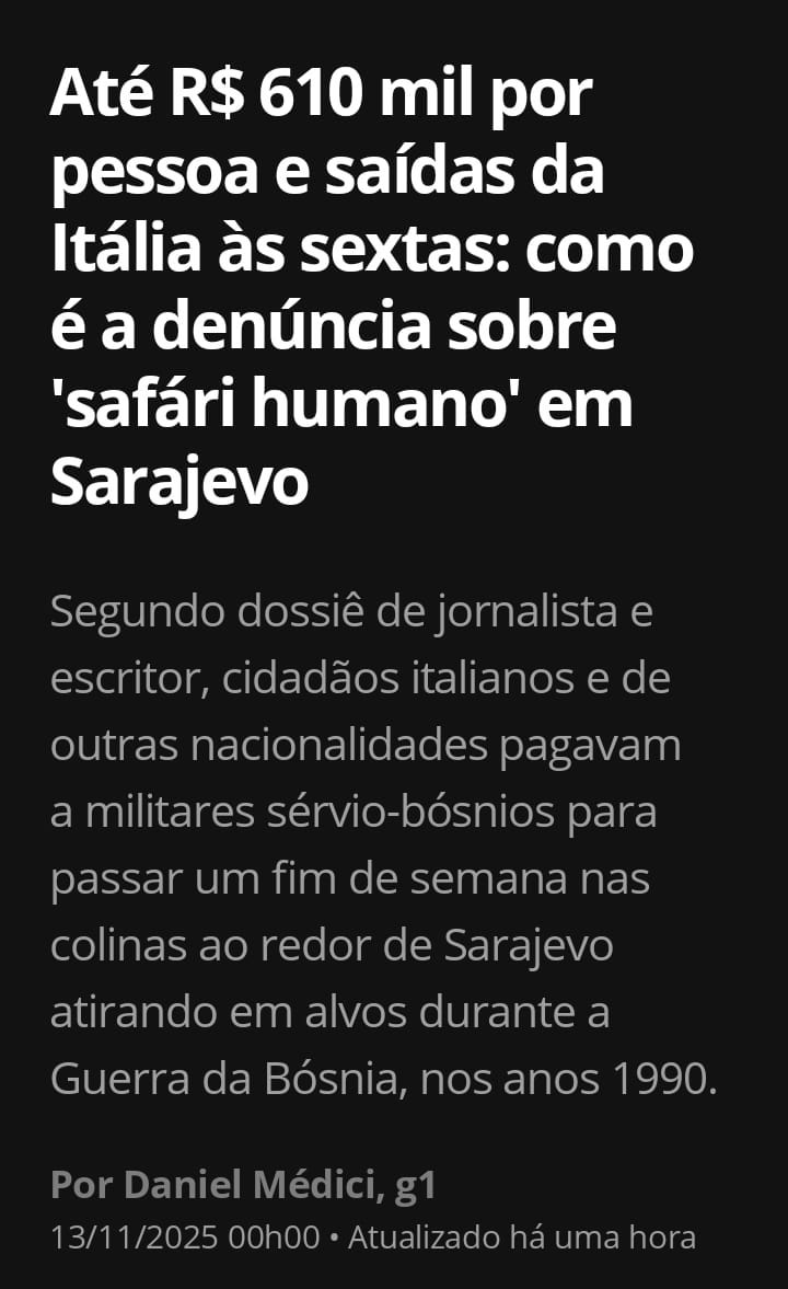 Por uma pequena fortuna, equivalente a até R$ 610 mil em valores atuais, “cidadãos respeitáveis” italianos, russos e americanos, entre outras nacionalidades, eram levados de uma cidade da Itália até um campo de batalha na Bósnia, nos anos 1990, para atirar em civis por diversão, numa espécie de “safári humano”. - G1, 13/11/2025